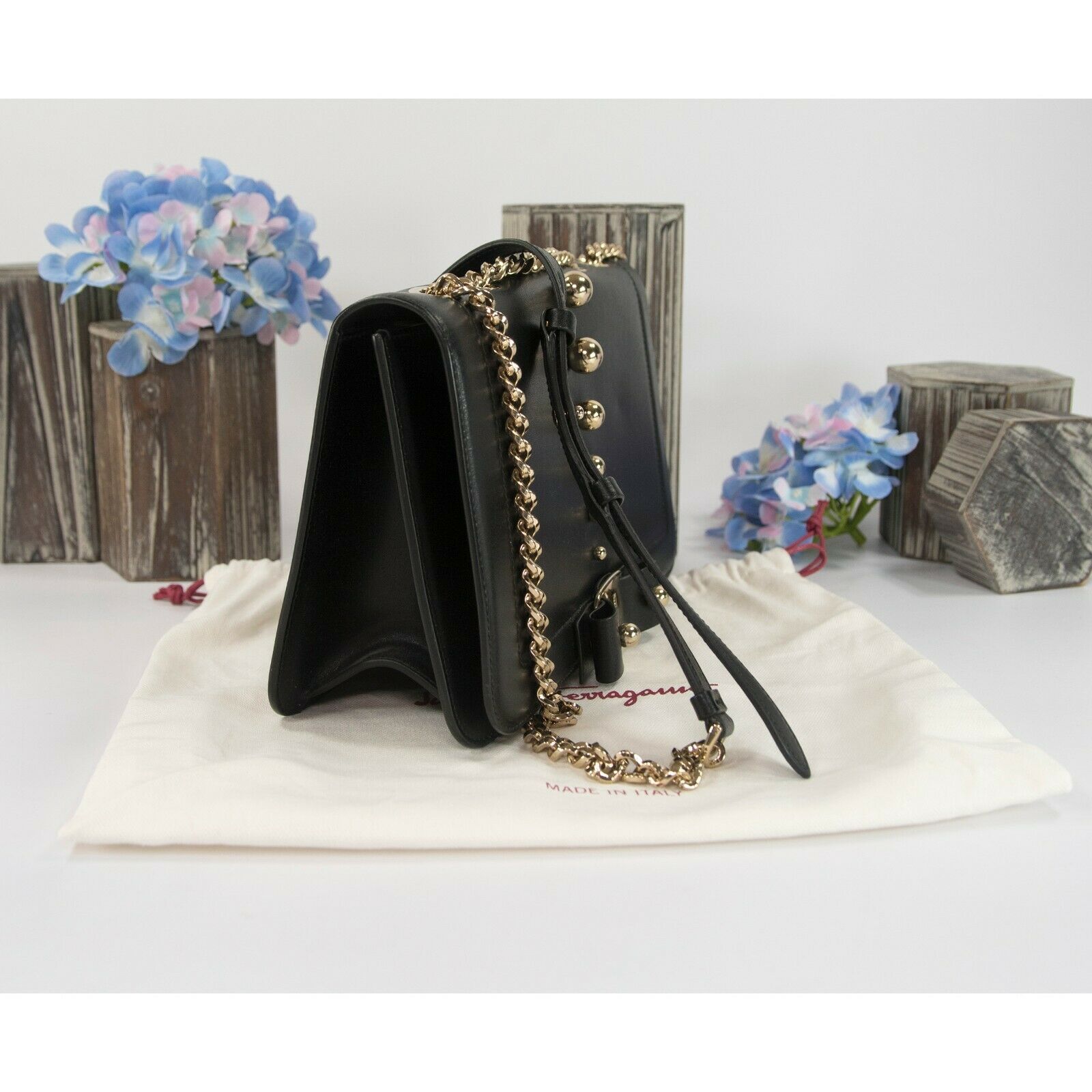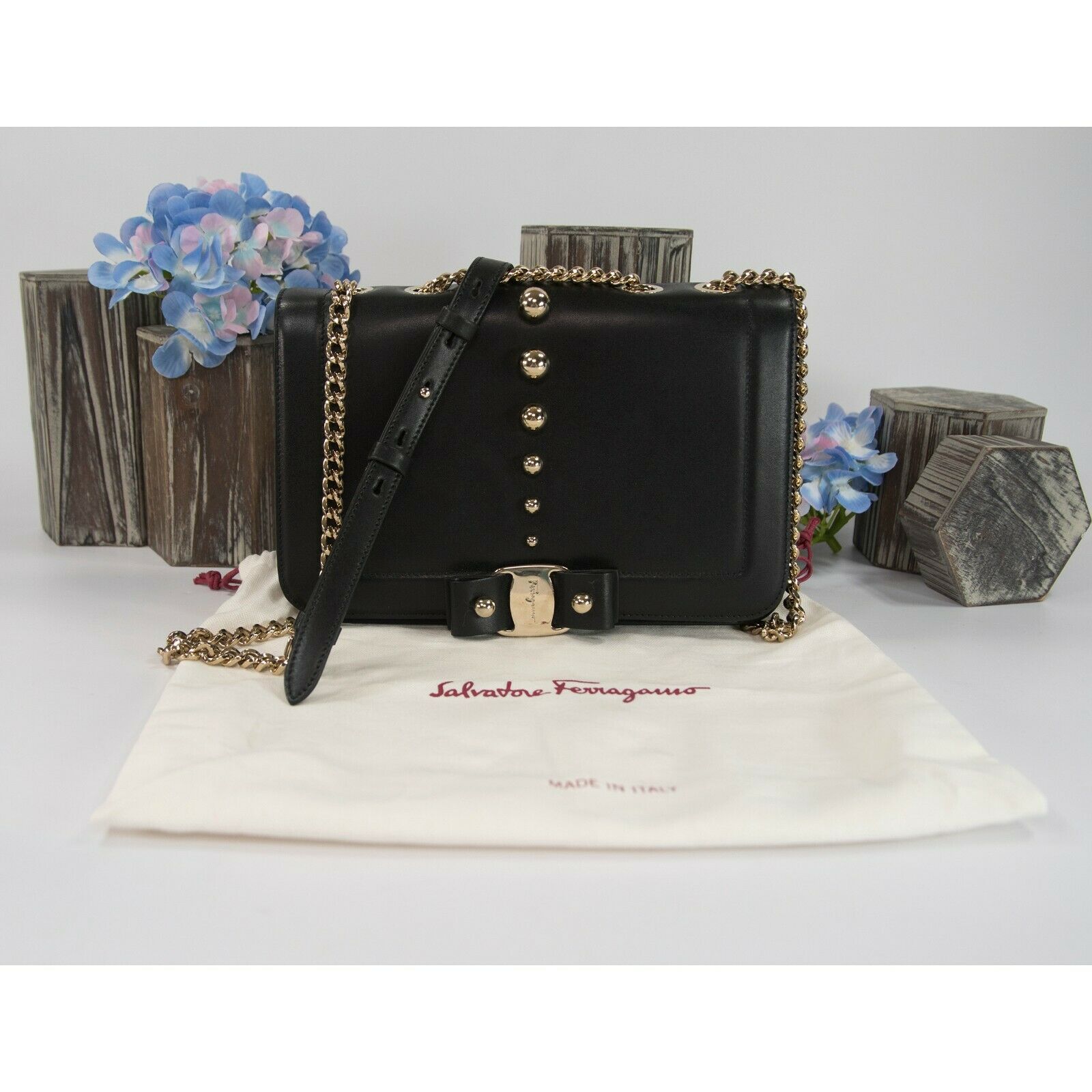 Salvatore Ferragamo Black Leather Studded Bow Crossbody Bag NWT